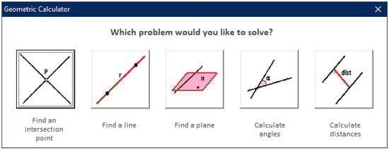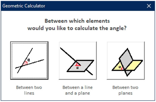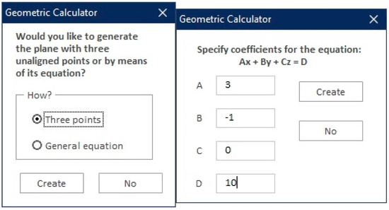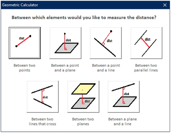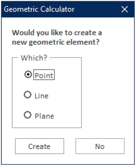 The objective of this first phase is to create the entities (geometric elements) with which the geometric calculator will work. First, the user is asked if they want to generate points, lines, or planes (Figure 3).