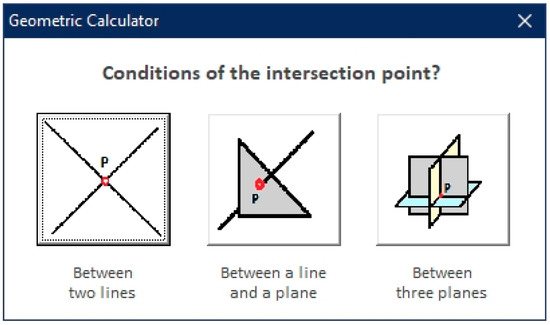 In this case, the point of intersection between two intersecting lines, between a line and a plane that are not parallel, or between three nonparallel planes (Figure 8) is addressed. The user must choose which option, and then select the geometric elements requested by the geometric calculator.
