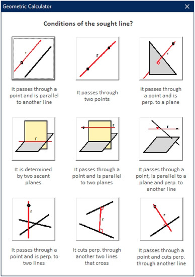 In this option, the user can choose between nine different problems. Each problem finds a straight line that meets certain conditions, such as parallelism, perpendicularity, and location within a plane (Figure 9).