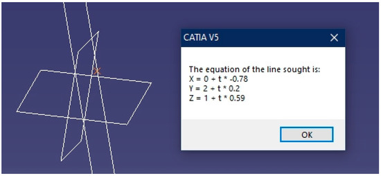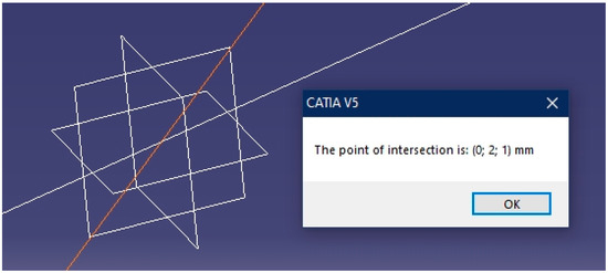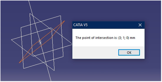 Once the geometric elements have been chosen, the calculator finds the intersection point and displays its Cartesian coordinates on the screen using a text box. This is achieved with the execution of the CATIA “Space Analysis” module, which enables dimensions to be used and measurements of the elements of the work environment to be taken. The code used is as follows: