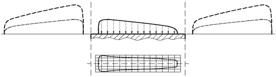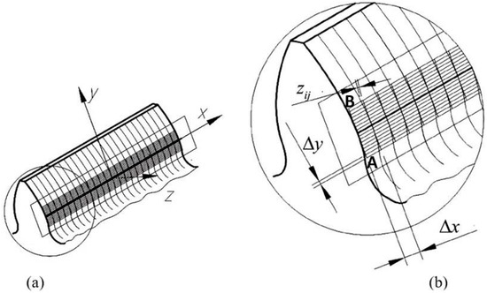 The influence functions were built with Love’s equations for the Boussinesq integral from the half-space theory [25]. At the common tangent plane, a virtual, rectangular contact area large enough to cover the real contact area is considered (Figure 1). The elastic displacements, (x, y) and (x, y), were measured along the common normal direction. For a certain point situated on the tangent plane, (x, y), the sum of each individual displacement is noted with (x, y). The semi-analytical method uses the initial, no-load separations between surfaces of the conjugate teeth that sustain the meshing process [25]. A virtual rectangular contact area, built on the common tangent plane around the initial contact line and a cartesian system, , are defined. A uniformly spaced, rectangular array is defined on the virtual contact area, with the grid sides parallel to the x and y axes. The nodes of the grid are denoted by , where the and indices refer to the grid columns and grid rows, respectively. The real pressure distribution is approximated with a virtual pressure distribution, characterized by a number, , of values of , which act uniformly inside the corresponding patch, [26,27].