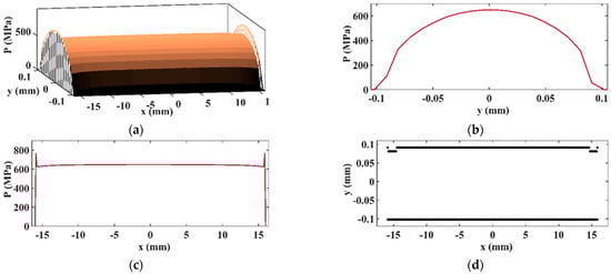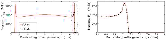 The contact between a crowned roller bearing and its raceway, analyzed using a FEM by de Mull et al. [34], has been chosen to exemplify the second method used for the validation of a non-Hertz solver (Figure 3). A good correlation exists between the subroutine that solves the equation group given in (1)–(6) and the FEM results from [34] (Figure 3).