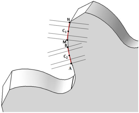 The steps (i)–(ix) are repeated for all discretization points situated on both tangent segments that correspond to pinion and gear contact points (Figure 5). The positions of each point vary depending on the position of the current chosen discretization point. An elementary side width between two neighbor points is:
