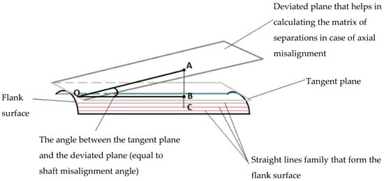 The procedure is also extended for each discretization point situated on the tangent segment of the gear profile. The matrix of separations was obtained by summing each distance from each discretization point to each determined point situated on the involute curve for each pinion and gear case. The described algorithm is applied until all separations are calculated. The separations are the same for all tooth widths, even though only the transversal profile is used for the tooth in the presented calculation procedure. This happens because the tooth flank surface is a ruled surface, with straight lines that are parallel to the gear axis (Figure 1). Figure 1 exhibits that all straight lines forming the tooth flank surface are parallel to the axis. In order to calculate the separation matrix, two tangent planes are drawn through and .