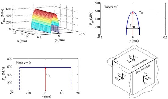 In their paper, Qin and Guan [7] used a FEM to investigate the development of contact fatigue. The authors concluded that the dynamic simulation results are closed to the static simulation results, especially when the von Mises stress is considered a critical stress for contact fatigue. Regarding dynamic simulation, a similar result was obtained by Hwang et al. [8]. Today, von Mises stresses are considered critical stresses that are able to cause rolling contact fatigue, also offering reliable explanations for some experimental data such as the sub-surface or surface initiation of RCF, the effect of residual stresses, the role of tangential forces, the influence of roughness and lubrication on the life of gears, the edge effect, and the influence of as misalignment and its attenuation by profile modification [9,10,11]. Roda-Casanova [12] used three different FEM configurations to illustrate the role played by deformations of gears shafts and deformations caused by shaft torsions upon pressure distribution and pressure values.
