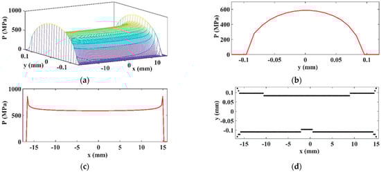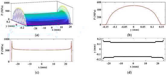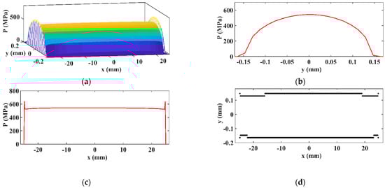 Due to the small number of discretization points, only the 3D pressure distribution and longitudinal pressure distribution are presented. The maximum values of contact pressure are as follows: Mpa according to the current SAM results, Mpa according to the FEA from [12], and Mpa according to the SAM from [12] (Figure 23).