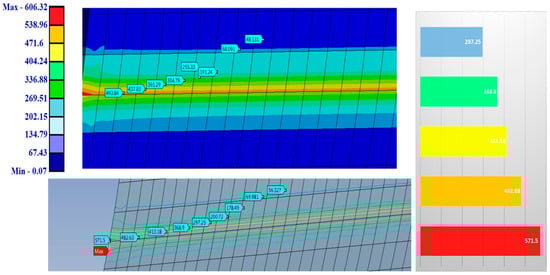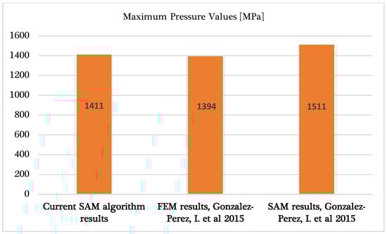 A FEM analysis was developed, and the final results are presented in Figure 16. The middle value is MPa for the current FEM simulation. The difference between SAM and FEM is approximately , which can be appreciated as a very good fit. Additionally, the inner stresses for this case were determined using a FEA. The maximum value of the von Mises stresses is around 570 MPa. In the following cases, the von Mises stresses will be determined using the SAM algorithm. The original FEA results were developed in order to better validate the accuracy of the virtual solver.