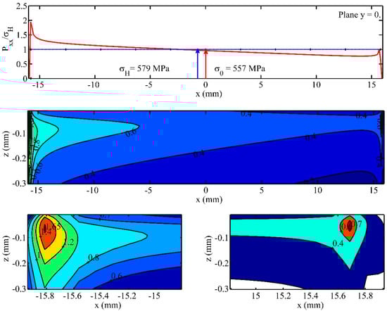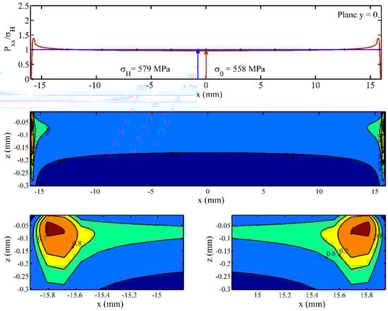 A significant Increase can be observed on the left side of the teeth of the contact pressure values. The maximum value of the contact pressure is approximately 1150 Mpa. Additionally, the von Misses stresses have much higher values on the left side. For every elementary volume of material appreciably stressed, Equation (38) connects the parameters referring to material (σu), load (σeq, z, h), volume of material (V), and the level of reliability corresponding to a certain number of loading cycles. Even if the balance equation is satisfied, the strong, non-linear character of Equation (38) establishes the requirement to identify the influence of each factor. At a depth of approximately −0.05 mm on the left side, the von Mises stresses reach a maximum value, with the ratio between the von Mises stress and the Hertz stress equal to 1.65. Thus, a value of 955.32 Mpa is observed for the von Mises stress on the left side. On the right side, obviously, the edge pressure value decreases, with the ratio between the von Mises stress and the Hertz value being equal to 0.7. Thus, a value of 405.3 Mpa is observed for the von Mises stress on the right side.