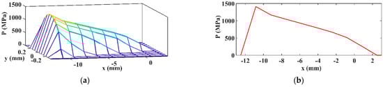 3D contact pressure distribution obtained by SAM (our results) (a) and longitudinal profile of pressure distribution (b).
