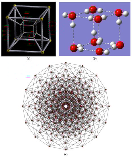 (a) A representation of the 4D-hypecube; (b) The S4 isomer of (H2O)8 and in relationship to an ideal cubic arrangement; Reproduced from [69] (c) the graph of the 8-cube octeract representation of water octamer with 256 vertices and 1024 edges. Figure 1 (c) reproduced from Tom Ruen, open source, copy-right free, Public Domain Image: https://commons.wikimedia.org/wiki/File:8-cube.svg, accessed on 28 January 2023.