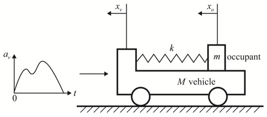 Matthew Huang et al. [25] used a classical simplified vehicle–occupant crash analytical model, which selected appropriate description parameters from the complex nonlinear system, to elaborate the interactions among the vehicle, occupant, and restraint system during the crash process. In the model, the vehicle and the occupant were simplified to mass blocks. The front-end structure and the restraint system were simplified to springs, according to the energy absorption characteristics. The relationship between the front-end structure and the restraint system was essentially vibration coupling. The vibration response of the occupant was solved by the frontal crash model, with the crash pulse as the system excitation and the restraint system characteristics as the system stiffness. This model was verified in the references [33,34,35].