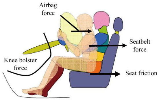 As shown in Figure 2, the ORS is mainly comprised of the seat belts, airbags, seats, and other parts. When a crash occurs, the ORS restricts the occupant motion in the vehicle, by exerting force on the occupant for purpose of occupant protection [37,38,39,40].