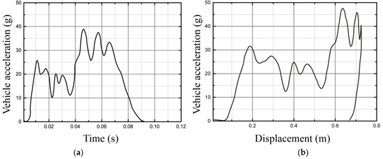 Crash pulse of a vehicle during a FRB test. (a) Crash pulse in the time domain. (b) Crash pulse in the displacement domain.