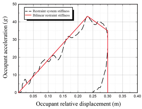 If the occupant is reduced to a particle, the force of the restraint system on the occupant can be made equivalent to a concentrated force, then the overall performance of the restraint system can be expressed using a restraint system characteristic. The curve of the occupant acceleration–relative displacement can approximately represent the force–displacement curve of the restraint system and is defined as a restraint stiffness curve. After CFC120 filtering, the restraint stiffness of a certain vehicle extracted from the NHTSA databases is shown in Figure 4. The shape characteristics of the constraint stiffness curve (black dashed line in Figure 4) were simplified to the bilinear restraint stiffness shown in the red line.