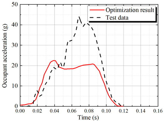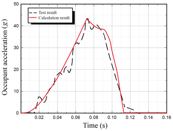 The crash pulse in Figure 3a was discretized, and the unit time after discretization was 0.0001 s. The discrete crash pulse and the simplified bilinear restraint stiffness were put into the vehicle–occupant crash analytical model, and then the model was solved using the proposed algorithm, to obtain the occupant acceleration, as shown by the red line in Figure 5. Compared with the occupant acceleration of the test data (black dotted line in Figure 5), the peak error of the calculated result was less than 1%, and the curve variation trend was basically the same. This indicated that the proposed algorithm has sufficient accuracy and could be used to further study the occupant response.
