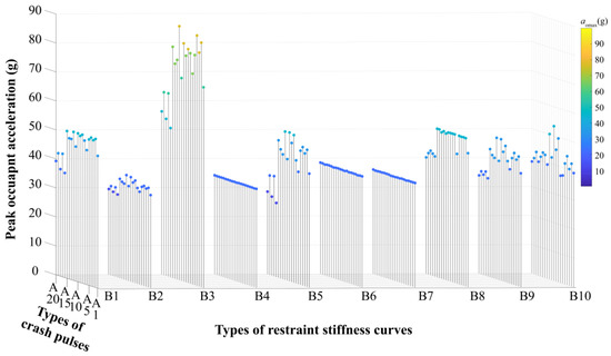 To further analyze the coupling relationship between the crash pulse and restraint stiffness, the crash pulse was taken as the X-axis and the restraint stiffness curve as the Y-axis, and the peak occupant acceleration corresponding to the crash pulse and restraint stiffness curve were drawn in a 3D scatter-plot. As shown in Figure 6, in the area where crash pulses A16, A18, and A20 are combined with restraint stiffness B2 and B5, the peak occupant acceleration is the lowest (less than 30 g). It should be noticed that A16, A18, and A20 are concave pulses, while B2 and B5 are upward curves. Therefore, it can be seen that the concave crash pulse and upward restraint stiffness curve have the best coupling effect.