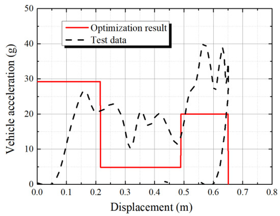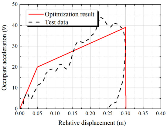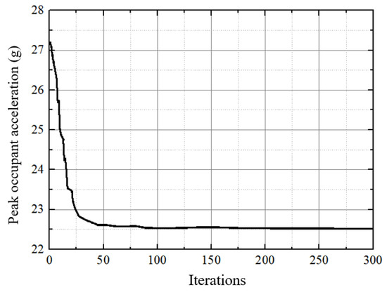 After 300 iterations, as shown in Figure 10, the final optimized peak occupant acceleration was 22.5 g, and the peak occupant acceleration had decreased by 44%. The optimized crash pulse and bilinear restraint stiffness curves are shown in Figure 11 and Figure 12, respectively. The optimization result was consistent with the conclusion in Section 3.2 that the coupling effect of a concave crash pulse and convex bilinear restraint stiffness curve is the best option. A comparison of optimization results with the original data is shown in Figure 13. It can be seen that the optimized result was significantly better than the original data. The coupling of the concave crash pulse with bilinear constraint stiffness can bring forward the peak of occupant acceleration and keep the acceleration stable in the medium term.
