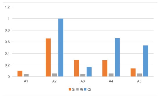 Table 9. Compromise measure . - Step 6 Sort according to the Qi value. Since < < < < , according to the value, the sorting scheme > > > > can be obtained, so the source of the fault is , which is consistent with the results in [29].The values, values, and values of the five alternative schemes are shown in Figure 4. The best scheme obtained is a1 according to the ranking of values from small to large, which is the same as the results in the literature [29], which proves that this model is feasible.