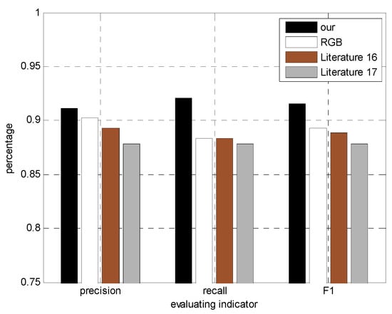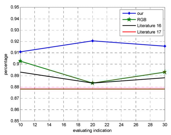 Table 2, we can see that our algorithm was compared with the single feature algorithm, which is better than the single feature algorithm in both the recall accuracy and the recall rate because the features fusion algorithm can compensate for the shortcomings of a single feature. Secondly, this paper’s algorithm was compared with Refs. [
