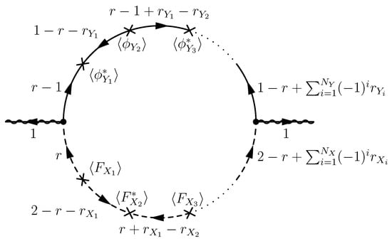 where the sum is over the vertices or the vertices in the loop diagram. Noticing the arrow directions of messenger field propagators and pairs of messengers with and without tilde connected to quadratic vertices, both the fermion part and the scalar part of the loop diagram in Figure 4 must have odd numbers of vertices inserted. Thus both and must be odd numbers.