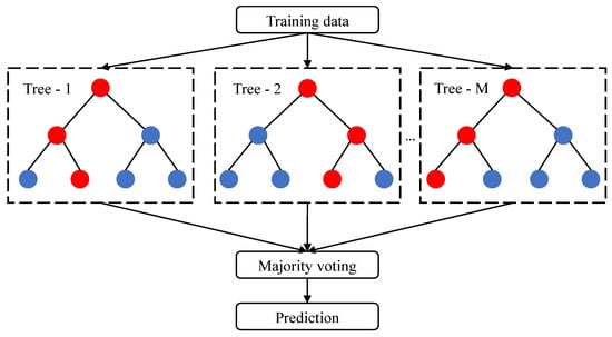 To obtain better prediction performance, ensemble methods employ a multiple of basic classifiers to make decisions. This approach generally shows increased classification performance over one basic classifier. The RF [31] is a powerful ensemble classifier; it combines bagging and feature randomness to train multiple DTs. The DT is a frequently used classification approach. It tries to learn a set of if–then rules to classify the data. An illustration of an RF is shown in Figure 1.
