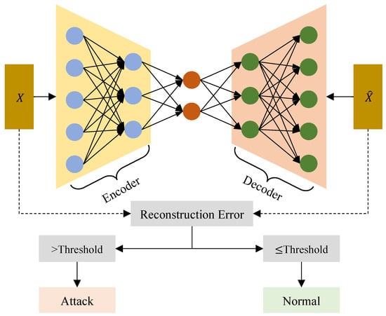 Deep learning has shown to be quite effective in a variety of research fields [33]. It learns data representations with multiple neural network layers. The other part of our suggested model is a special unsupervised neural network [34], an AE. As it can rebuild the input, the reconstruction error can serve as the anomaly score for identifying abnormalities. The framework for anomaly detection using AE is depicted in Figure 2. We introduce the general process later.
