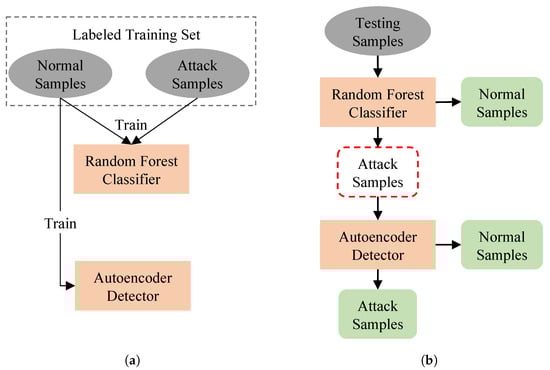 In total, we integrate these two techniques, leveraging the probabilistic RF and AE. The approach has two parts: training and testing. We present the two parts in Figure 3. In the training phase, each model is trained with a different subset of the dataset. Considering the labeled dataset at hand, we can train a binary classifier using an RF classifier. Then, an additional AE is constructed utilizing normal samples from the training set only. As the RF is trained on the labeled dataset, we use its output probability to make decisions for detecting attack samples.