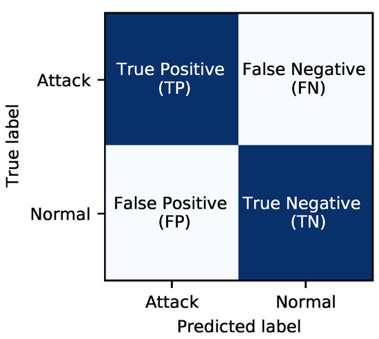 Considering the attack type as the positive one, there are four classification results between the true label and prediction label: true positive (TP), false negative (FN), false positive (FP), and true negative (TN). One TP record, for example, indicates that an attack sample is correctly classified as anomalous. We list the four conditions in Figure 4.