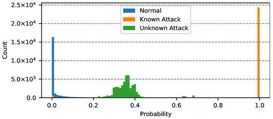 In the figure, the samples’ distribution of probability is plotted, where the x-axis is the probability, and the y-axis is the number of samples. From the figure, we can see that the probability of normal and known attack samples being distributed on the two sides is generally 0 or 1. However, the unknown attack samples are located in the middle position. From this point, if we use the default “predict” method, the normal and known attacks can be classified correctly, but the unknown attacks would be misclassified as normal.