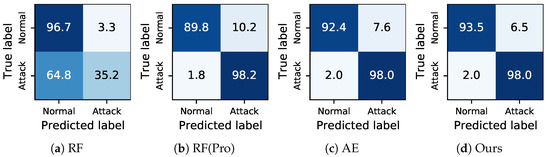 The first RF shows the lowest detection rate, as 64.8% of attacks have been wrongly categorized as normal. When it uses the highest probability to classify (as we can see from Figure 5), it wrongly classifies some unknown attack samples as normal. From Figure 7b, it can be seen that only 1.8% of attack samples were misclassified as normal for the RF(Pro) classifier. It has a big improvement over the RF classifier. Furthermore, the AE detector has a higher TP rate. In the final analysis, our proposed combination methods achieved the lowest FP fraction when compared with the other two. As stated before, we apply the AE to the RF results and relabel some attack samples that have a lower MSE as normal. In this manner, the combination method has a lower FP.