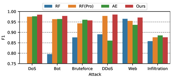 After analyzing the average detection performance on different attacks, it is reasonable to investigate the performance of various classifiers when dealing with different unknown attacks. For simplification, we report the methods related to RF and AE for the IDS2018 dataset. We plot the F1 and FPR only in Figure 8 and Figure 9, with the consideration that F1 is the harmonic mean of recall and precision. Additionally, the FPR can prove the improvement of our method.