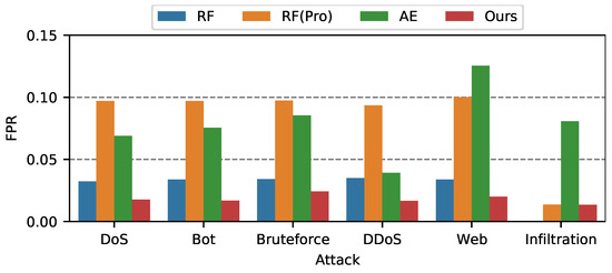 In Figure 8, there are six different attacks. The probability-based RF performs better than the classical RF method in most cases. Furthermore, our method presents the highest F1. The results shown in Figure 9, our combination method reduces the FPR significantly.