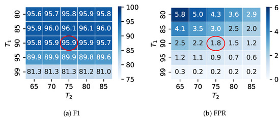 At first, we find that the FPR in Figure 10b decreases with increases in and . However, F1 presents a different pattern with the change in threshold. When the achieves the highest value, i.e., the 99th percentile, the F1 presents the lowest value. This is because with higher , more and more attack samples are missed, although the FPR is lower. The F1 does not change too much, as with the varied ; however, FPR is lower.
