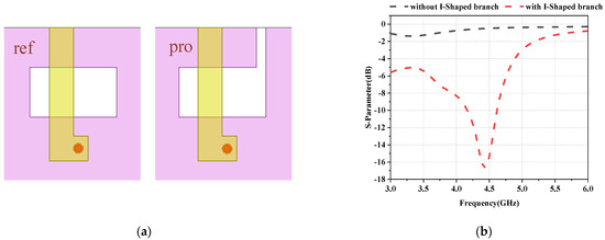 Design evolution of the antenna element structure. (a) The structure of the reference and proposed antenna. (b) The comparison of the reflection coefficient between the reference and proposed antenna elements.