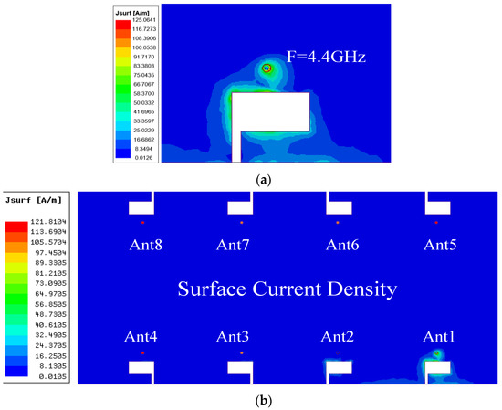Surface electric current on the antenna ground plane when Ant1 is excited at 4.4 GHz. (a) Local current distribution. (b) Overall current distribution.