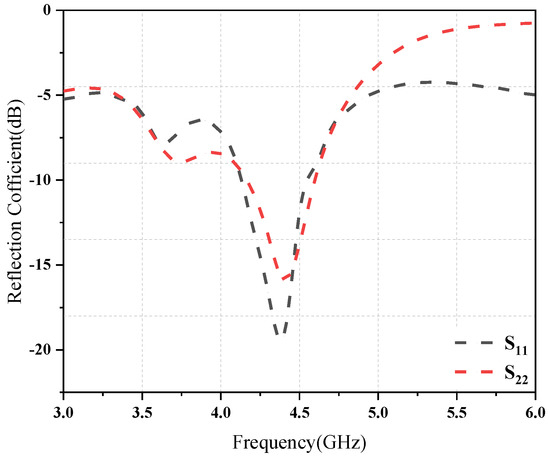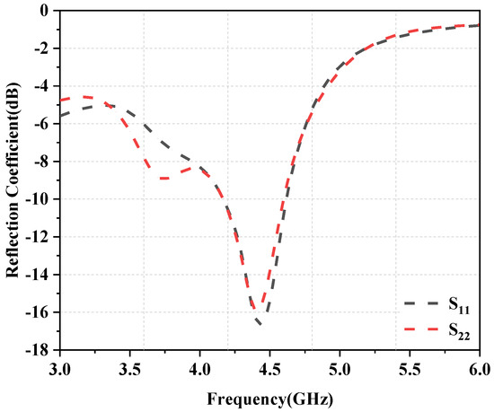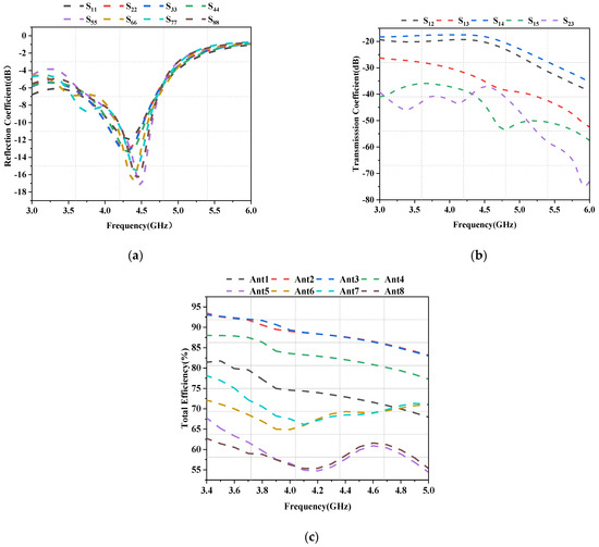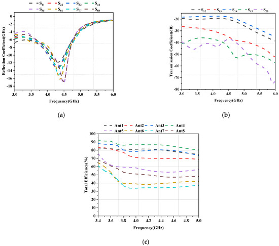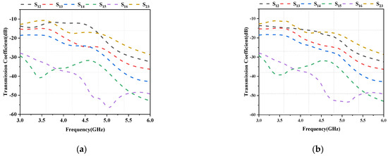 The simulated reflection coefficients for Ant1 and Ant2 are plotted as a function of frequency in Figure 5, and the reflection coefficients are greater than −6 dB in all operating frequency bands. Next, Figure 6 shows the measured reflection coefficient values for Ant1 and Ant2. As is evident from the figures, the simulation findings are quite similar to the test results. The proposed antenna exhibits near-ideal measured 6 dB impedance bandwidths (3:1 VSWR) of 5.71% (at 3400–3600 MHz), 5.40% (at 3600–3800 MHz), and 6.59% (at 4400–4700 MHz). Figure 7a shows the simulated coupling values for various antenna element combinations, while Figure 7b shows the corresponding measured values. The isolation amplitude is greater than 11 dB in the covered 5G NR band (N77/N78/N79).