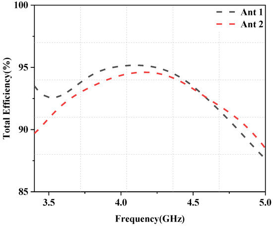 Figure 8 shows the planned antenna measurement setup in a microwave-protected far-field anechoic chamber. Meanwhile, the simulated radiation efficiency values for Ant1 and Ant2, which were found to be greater than 87%, are shown in Figure 9.