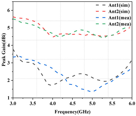 Simulated (Sim) and Measured (Mea) peak gain values of Ant1 and Ant2.