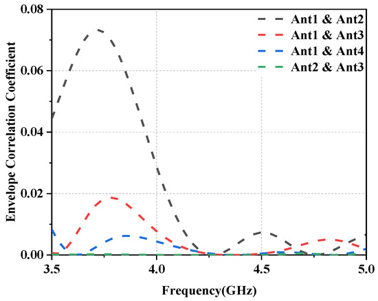 In general, the performance of MIMO antennas is primarily determined by the antenna elements’ diversity and multiplexing capabilities. As a result, it is critical to examine the multiplexing and diversity performance of MIMO antenna arrays in addition to the S-parameters and radiation characteristics. In this regard, the Envelope Correlation Coefficient (ECC) is the most important metric for estimating and validating antenna diversity characteristics, which can be calculated using Equation (1) [27]. It can be seen from Figure 12 that the calculated ECC value is less than 0.08 in the entire operating frequency range for the proposed design, thereby indicating a good diversity performance.