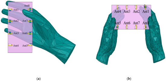 Figure 13a shows the hand configuration with the proposed antenna design in one-handed mode (SHM). Similarly, Figure 13b shows the proposed antenna design in two-handed mode (DHM). Because of their direct contact with the finger, Ant5, Ant6, Ant7, Ant8, and Ant2 exhibit high reflection coefficients under SHM, as shown in Figure 14a. In contrast, because they are farther away from the fingers and still operate in the 3.4–4.7 GHz band, Ant1, Ant3, and Ant4’s reflection coefficients are less affected. Ant1, Ant3, and Ant4’s reflection coefficients, on the other hand, are less affected because they are farther away from the fingers and still cover the 3.4–4.7 GHz band. Their reflection coefficient, however, is slightly higher than in the situation with no hand interference. Nonetheless, the isolation over the entire/desired operating band is greater than 10 dB for all antennas. Besides, as shown in Figure 14c, the radiation efficiency of Ant6 and Ant7 reduces to less than 65%, since the hand tissue can absorb electromagnetic waves. Similarly, Ant2 and Ant8 are also less efficient owing to their proximity to the palm. On the contrary, Ant1 and Ant4 are located far from the hand and hence show efficiency greater than 80%.