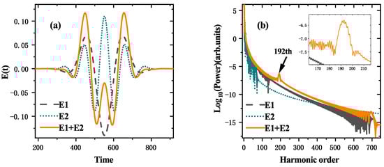 Figure 1a shows the laser pulses used for this paper. The black dashed line represents the fundamental frequency laser field, which has a peak field amplitude of , a wavelength of 1600 nm, and an initial phase of 0. The high frequency laser field, which has an 800 nm wavelength and a peak field amplitude of , is shown by the green dotted line. The orange solid line represents the change of the electric field amplitude of combined pulses with the time. Figure 1b displays the harmonic spectra (in fundamental light single photon energy units) generated by the three respective laser fields. The cutoff energy of the high frequency laser field’s harmonic emission spectrum (green dotted line) is small, being in the 62nd order. In contrast, the cutoff energy of the harmonic spectrum under the fundamental frequency laser field (black dashed line) is in the 688th order. The harmonic efficiency also decreases more quickly as the harmonic energy increases. The cutoff position of the harmonic spectrum (orange solid line) in the combined pulse action increases to the 706th order, and the conversion efficiency is significantly enhanced in the energy range of the plateau region compared to the harmonic generated by the fundamental frequency laser field. It is interesting to observe the harmonic emission peak in the two-color fields near the 192nd harmonic, and its strength is significantly larger than in the case of the fundamental laser pulse.