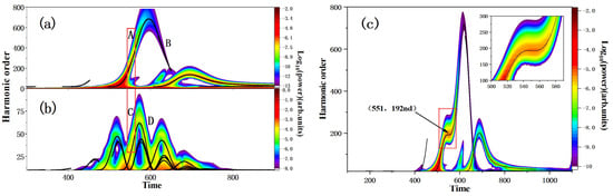 In the following, we examined the time-frequency behavior of the harmonic emission to determine the cause of the sharp rise in the harmonic efficiency under monochrome field and combined laser beams, as shown in Figure 2. The wavelet transform is used to display the harmonic emission’s time-frequency characteristics. Figure 2a,b show the time-frequency distributions of the high-order harmonic emission generated in monochromatic laser fields with driving laser wavelengths of 1600 nm and 800 nm. Figure 2c shows the time-frequency distribution of the high-order harmonic emission generated by the interaction of the combined two-color laser field with atoms at wavelengths of 1600 nm and 800 nm. There are five emission paths in the time-frequency diagram. The emission times are around 420, 500, 600, 650, and 750, respectively. The cut-off energy of the first emission trajectory is the 50th order, the second emission path and the fourth emission trajectory intersect near the 760th order, the cut-off energy of the third emission trajectory is about the 150th order, and the fourth and fifth emission trajectories intersect at the order of 250th. The main photon emission time is from 500 to 550. It can be seen from the black solid line in the figure that the primary emission path in the quantum simulation can be accurately reproduced using the classical three-step model calculation. When the emission time is around 551, as indicated by the red box in the figure, it is evident from the time-frequency behavior of harmonics that there is a large emission near the 192nd order. Instead of following the typical harmonic trajectory, the harmonic emission at this energy has a folded structure. From the red box of Figure 2a,b, we label the main long and short trajectories related to the folding structure of the enhanced orders. The electron that gets the most kinetic energy when the electrons are ionized departs the atom after each peak of the field and impacts the nucleus again. Less kinetic energy is returned by electrons with later (short trajectories A and C) or earlier (long trajectories B and D) nucleus hits. As a result, the recolliding electron emits two contributions to the HHG radiation, one from the long trajectory and the other from the short trajectory, both of which are up- or down-chirped. This folded form can also be accurately reproduced using the conventional three-step model calculation. Next, we will analyze the electronic ionization and recombination instants through the classical simulation to understand the reason for this part of the harmonic enhancement.
