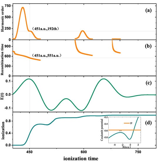 The calculated harmonic emission energy in three-step model fluctuation with the ionization time is depicted in Figure 3a. As can be observed, there are basically two portions of the ionization period after the ionization of the electrons: 420–470 and 575–625, in which the ionization time of the 192nd order harmonic is close to 451. The previous study has shown that, in order to produce harmonics with high intensities, the ionization rate at the ionization instant must be sufficiently high, the associated electron ionization chance must be high, and the electron must be able to quickly return to the parent ion. As a result, we further examined the relationship between the ionization time and the fluctuation of the recombination time, as shown in Figure 3b. The graphic shows that the electron ionizes at 451 and returns to the parent ion at 551. This duration is less than half the optical period of the fundamental frequency driving laser field, and the wave packet dispersion effect produced by the ionization electron is small. The time-dependent amplitude of the driving laser and the ionization probability change with time, as shown in Figure 3c,d. The electrons have the chance to ionize quickly at this time, creating more ionized electrons with the potential to return to the nucleus. This is because the peak field amplitude of the driving pulse is higher at the instant 451, which is . The ground state is already over the potential barrier created by the atom and the driving laser field at this point, as exhibited in the inset of Figure 3d, which means that the electrons have the chance to ionize quickly by over-barrier ionization. This fast ionized electron returns to the parent ion in a short time to produce the harmonic radiation, which is significantly more efficient than the other harmonics.