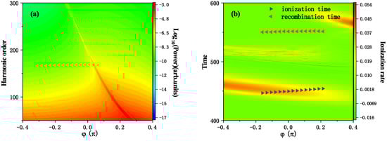 The phase delay between the two-color laser pulse will be crucial for the harmonic emission as well as the attosecond pulse modulation. Therefore, we carefully examined how the phase delay between the two-color field affects the harmonic efficiency. Figure 4a shows the harmonic emission spectra when the phase difference changes from −0.4–0.4 . It can be seen from the figure that, with the change of the phase difference, the harmonic behavior is much different. Only when the phase difference is −0.2–0.2 , can the enhancement of a specific order harmonic be observed in the harmonic emission spectrum. An IR laser and its second harmonic, which has the special property that two subsequent half-cycles become distinct instead of just opposite in sign, are used to regulate the generating electric field at the subcycle level. With the phase delay, the symmetry of the laser pulse’s electric field will vary, the symmetry of the pulse in the time domain will fluctuate, thus regulating the time domain symmetry of the quantum trajectory of the electrons generating the high-order harmonic. In this range, the order of the enhanced harmonic also increases rapidly from 50th to about 300th with the increase of the phase difference. Based on the analysis of the ionization rate and the duration from the ionization to the recombination, we also checked the effect of different phase delays on HHG. Figure 4b shows the change of the time-dependent ionization rate with the phase delay. As can be found in the figure, there is a noticeable ionization rate augmentation near 450 and 475. The three-step model calculation shows that a higher ionization rate occurs at the harmonic ionization moment with greater efficiency (black triangular shape). The harmonic with improved efficiency’s recombination moment (red triangle shape) is also shown in the illustration. As can be observed, the dispersion effect is minimal and the produced harmonics are extremely effective since the time between the ionization and the recombination in the harmonic enhancement region is very short (less than half the optical cycle of the fundamental laser field).