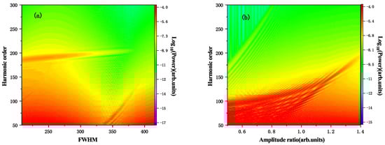 We also investigated the impact of FWHM as well as the peak field amplitude ratio of the two-color driving laser pulses on the harmonic intensity after clarifying the harmonic enhancement mechanism. With a peak field amplitude of for the electric field’s fundamental frequency and for the high frequency electric field, Figure 5a shows the change in the harmonic emission with the FWHM for = 0. As can be seen from the figure, the enhancement of specific order harmonics can still be observed as the driving laser pulse width increases, and the energy of the enhanced harmonics increases slightly. The harmonic enhancement peak at high energy vanishes when the driving laser pulse width is greater than 325. Correspondingly, a peak of the harmonic enhancement can be noticed near the low energy region. Figure 5b displays the modification of the high harmonic emission spectrum with the change of the driving laser electric field amplitude ratio for = 0, FWHM = 310. When the peak field amplitude ratio is less than 1, the harmonic enhancement of the specific order is not obvious and mainly reflects the behavior of the monochromatic field. When the peak field amplitude ratio is more than 1, the phenomenon of the harmonic intensity enhancement of a certain order starts to show itself and, as the amplitude ratio rises, this harmonic order moves to the high energy region. The above analysis indicates that the strong ultrashort two-color pulse scheme can be used to produce a particular order harmonic emission with high intensity through over-barrier ionization to boost the ionization rate and control the return of electrons to the parent ion in a shorter period. The particular order harmonic with high intensity may be efficiently altered by adjusting the peak field amplitude ratio, the delay of the two-color field, or other factors.