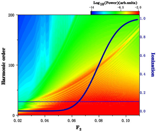 It is worth noting that ionization has a great influence on harmonics. When the laser intensity is high during the interaction with the gas target, numerous ionized electrons are generated for pulses with long laser pulse widths. Usually, the ionization probability of atoms under the influence of a long pulse width cannot be too high, and the ionization probability is typically less than 0.1. This is because the ionized electrons will cause the driving laser to de-focus and diminish the strength of the driving laser field. However, under the condition of low gas density, the defocusing effect of the light field will be weakened and this limit can be broken for short-pulse laser action by regulating the density of the gas target and laser focusing conditions, and high intensity harmonic emission and attosecond pulses can still be observed at an ionization probability of 1 [59]. In this work, the driving laser is an ultrashort pulse, so the effect of ionization can still be controlled by modulating the driving laser focusing conditions to enhance the intensity of specific harmonics. The effect of ionization probability on harmonic enhancement was systematically investigated by varying the laser intensity and is shown in Figure 6. As can be seen from the figure, the harmonic intensity is enhanced to different degrees at specific orders for both weaker and stronger fields. The blue curve in the figure shows the corresponding ionization probability changes with the laser field strength. It is evident that, as the field strength grows, the probability of ionization similarly rises, at first slowly, then quickly at the strength of 0.06–0.08, and finally progressively approaching 1. The blue line is the reference line with ionization of 0.1. We can clearly see the enhancement of the high-order harmonic intensity even under the ionization probability of less than 0.1. Figure 6 shows that, as the field strength becomes larger, the order in which the enhancement appears changes and the enhancement becomes more pronounced.
