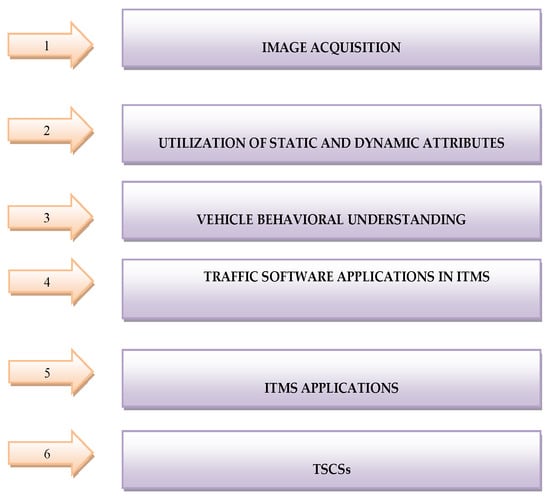 This paper discusses major sic components. These components are named (I) image acquisition, (II) utilization of static and dynamic attributes, (III) vehicle behavioral understanding, (IV) traffic software applications in ITMS (V) ITMS applications, and (VI) TSCSs. Figure 1 depicts the flow of the component and Figure 2 depicts taxonomy of the article.