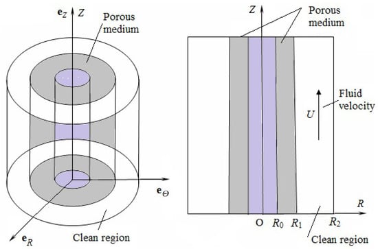 Let us consider the isothermal unsteady unidirectional motion of an incompressible viscous liquid in the flow area highlighted in Figure 1. This area is situated between two impermeable solid cylinders of radius and . It consists of a porous cylindrical layer and an outer annular region . The fluid flow along the symmetry axis of the cell is driven by a constant pressure gradient.