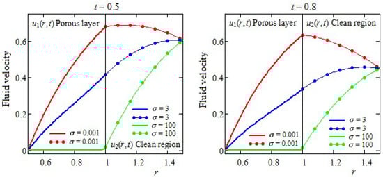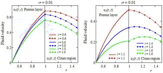The velocity profiles given by Equations (20) and (22) are shown in Figure 2 and Figure 3 at different time points and different values of the dimensionless permeability parameter , respectively. By definition (8), the parameter is responsible for the value of porous medium permeability for a fixed size of the cell. Big permeability of porous medium corresponds to small values of the parameter . In this case, the porous layer is almost transparent for the flow. The big values of the permeability parameter correspond to an almost impermeable porous medium. The curves drawn in Figure 2 represent the fluid velocity profiles in the two regions at different moments of time and for a small value of the permeability parameter , namely (porous medium with high permeability). Figure 2 shows in parallel the curves corresponding to small time values, respectively, and those corresponding to higher time values. This comparison is necessary to highlight the influence of the velocity value on the outer surface on the velocity field in the entire flow domain. It is observed that the fluid velocity is decreasing with time. This is due to the fact that the fluid velocity on the outer cylindrical surface is a decreasing function with respect to time .