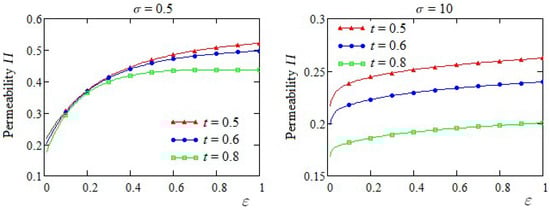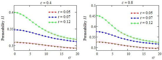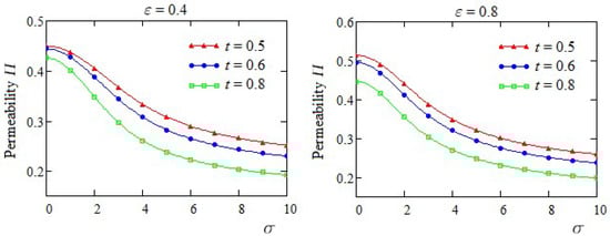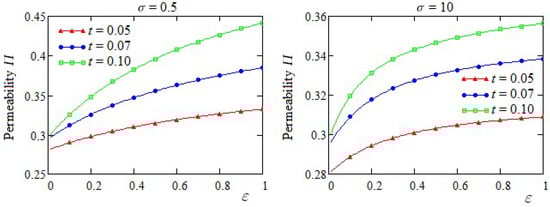 The influence of the local porosity of the porous medium on the hydrodynamic permeability is brought to light by the curves drawn in Figure 6 and Figure 7 for two values of the dimensionless permeability parameter and different values of the time t. As expected, hydrodynamic permeability increases with the local porosity.